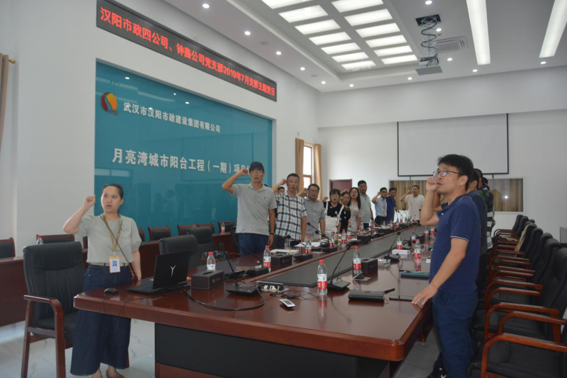 ? ? ? 活動伊始,盧永紅同志通報了黨員到會人數以及黨費繳納情況。緊接著,全體黨員起立合唱國歌,洪亮的國歌聲響徹了會議室,黨員昂首挺胸、莊嚴肅穆。隨后在后勤黨小組組長劉艷新同志的帶領下,全體黨員重溫了入黨誓詞,現場施工黨小組組長張云同志則帶領全體黨員重溫了《黨章》。