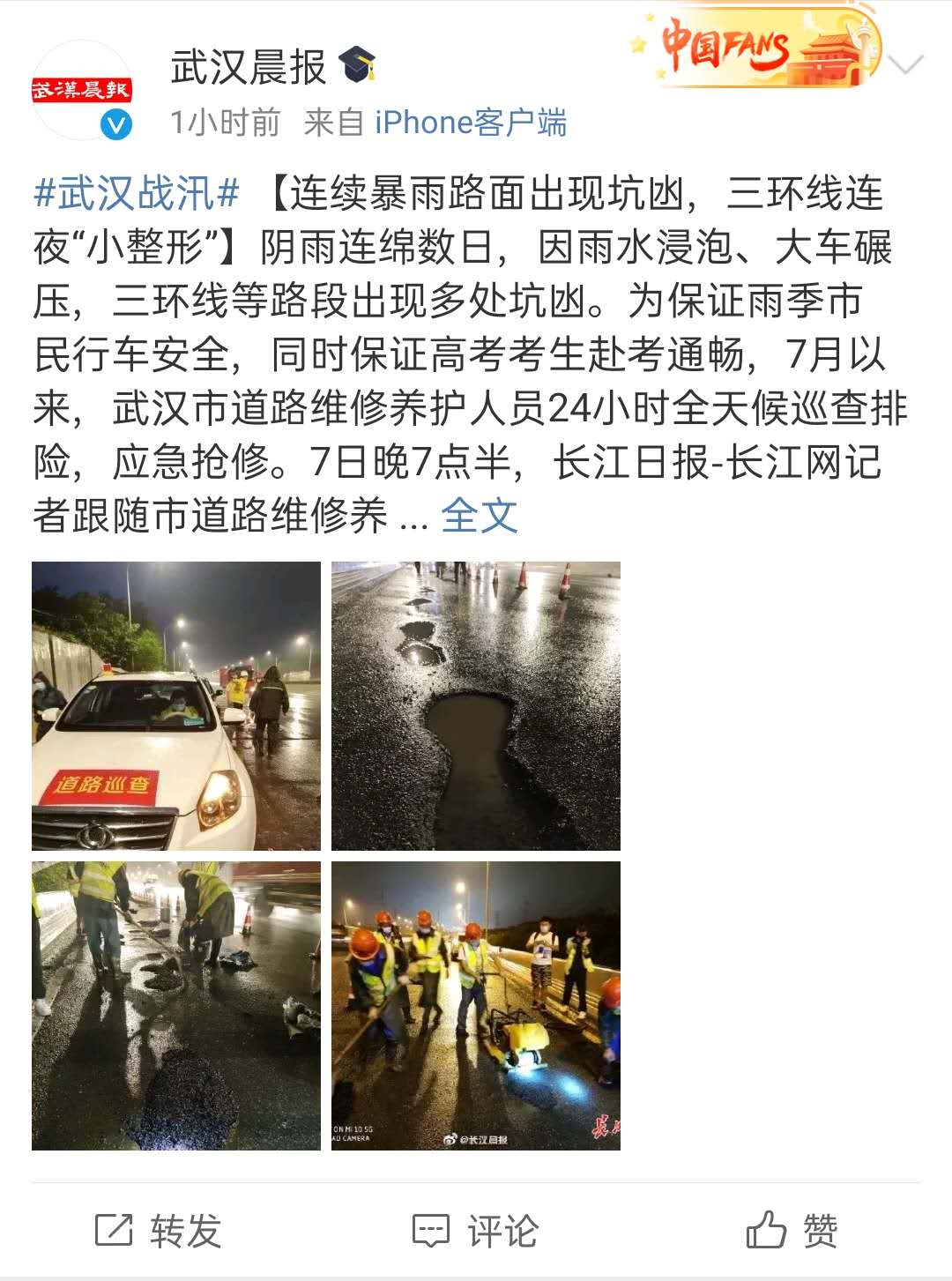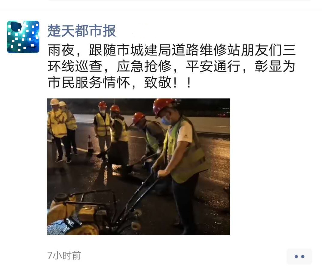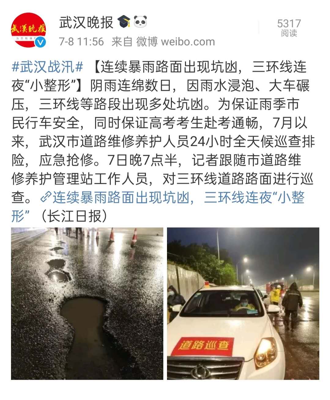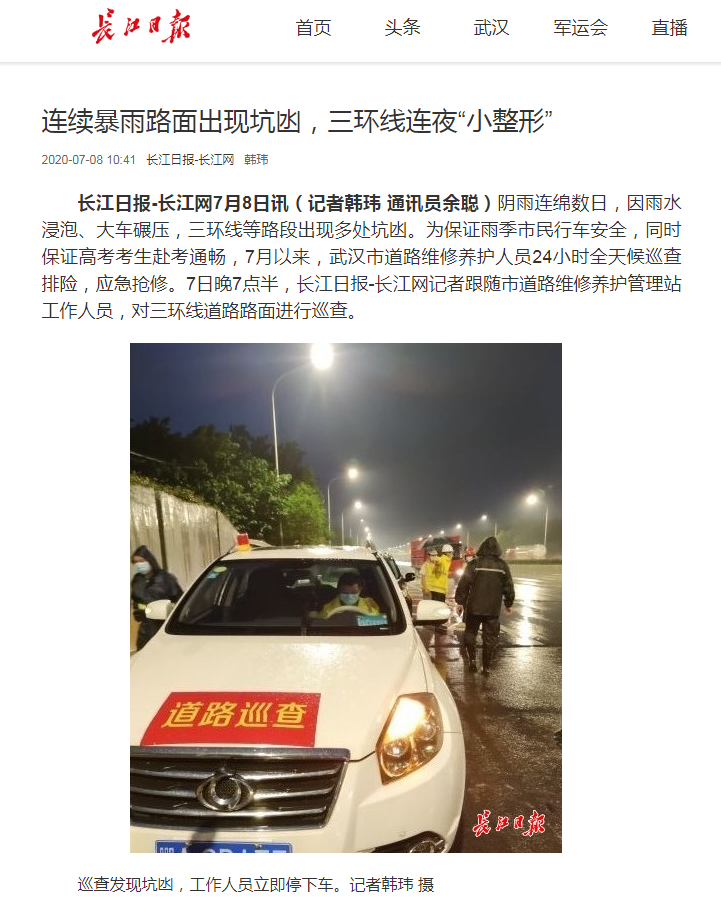 ? ? ? 近日,武漢市陰雨連綿,許多路段因雨水浸泡、車輛碾壓等出現坑凼,嚴重影響了交通安全。為保障雨季市民行車安全,助力高考考生赴考通暢,7月以來,漢陽市政六公司24小時全天候巡查排險,提前預防、提前搶修,積極修復受損路段,做到應急搶修不斷檔,獲得了民眾的一致好評,并被《長江日報》《武漢晨報》《武漢晚報》《楚天都市報》等主流媒體報道。