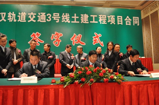 2月16日下午,連通三金潭到沌陽大道的武漢軌道交通3號線一期土建工程項目合同簽字儀式在武漢香格里拉大酒店隆重舉行,標志著武漢地鐵又一條線路進入實質性建設階段。武漢地鐵集團總經理劉玉華與14家中標單位代表簽訂施工合同,武漢市發改委副主任熊貽沛、市相關部門領導、地鐵集團董事長涂和平及其主要領導出席簽約儀式。