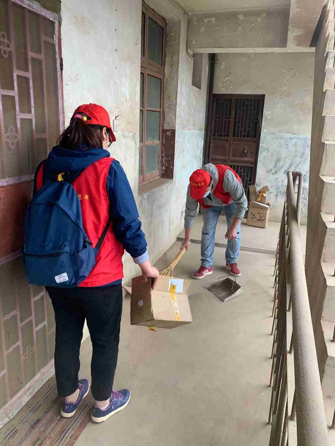 下午三點,雨還在下,下沉黨員等不及雨停,便紛紛穿好志愿服,拿起勞動工具,在社區工作人員的帶領下前往七處二所小區。男女搭配干活不累,在進行簡單的任務分工后,男生拿起鐵鍬開始清理淤泥和青苔,女生則負責撿掃垃圾、清理小廣告。