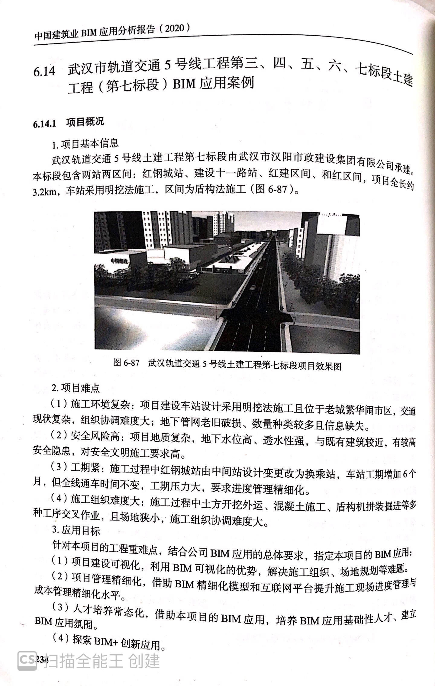 《報告》第6章BIM技術應用典型案例匯編章節中,以漢陽市政四公司承建的“武漢市軌道交通5號線第七標段土建工程BIM技術應用成果”為典型案例,進行展示與分析。此章節從項目概況、BIM應用方案、BIM實施過程、BIM應用效果總結四個方面,對5.7標項目BIM技術應用情況進行了全面且詳細的介紹。