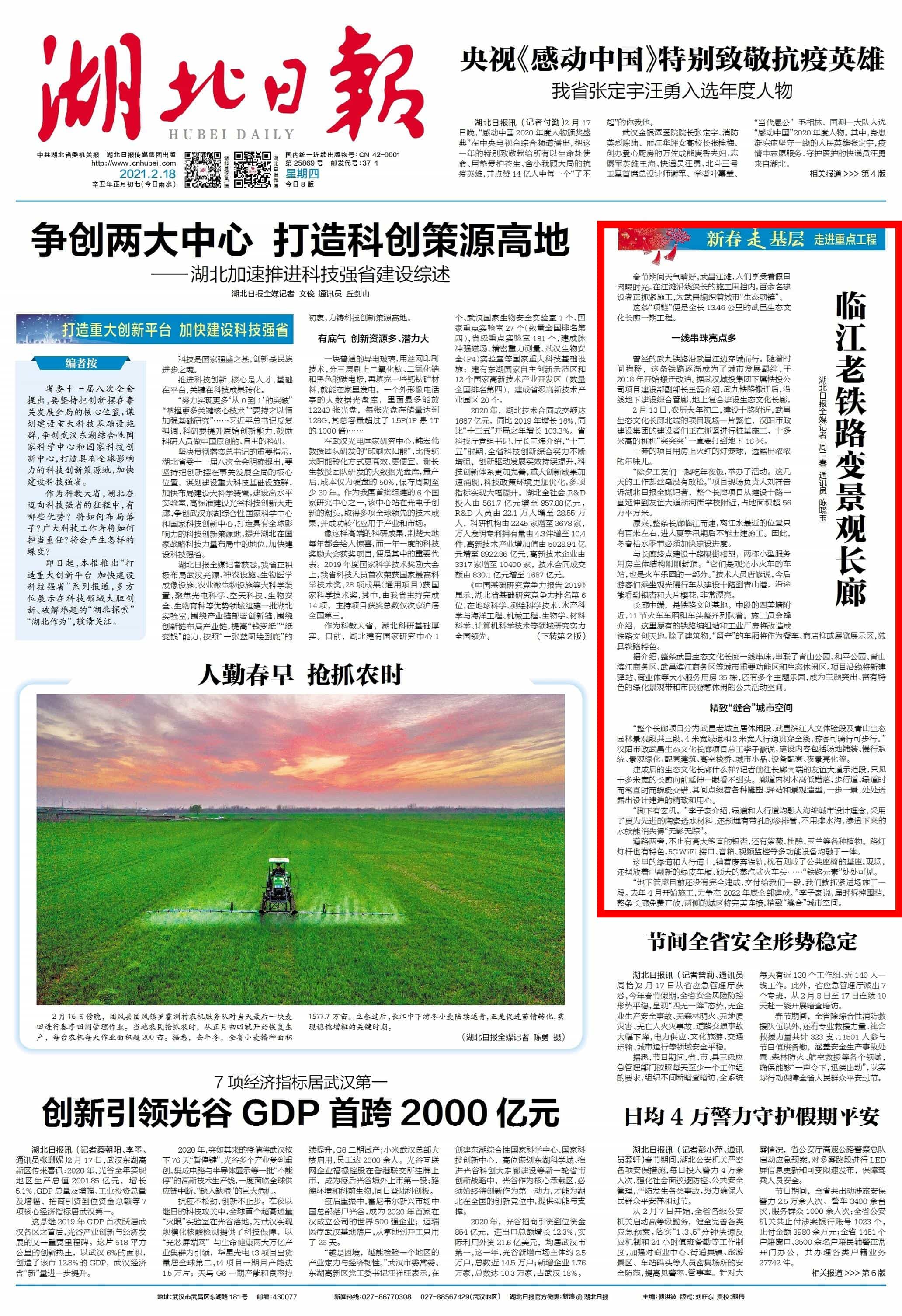 ? ? ? 2月18日,大年初七,新年后上班的第一個工作日,湖北日報(bào)頭版報(bào)道漢陽市政在建項(xiàng)目——武昌生態(tài)文化長廊施工進(jìn)展和工程亮點(diǎn),點(diǎn)贊漢陽市政建設(shè)者們利用春節(jié)假期搶抓工期,為武昌編織城市“生態(tài)項(xiàng)鏈”。