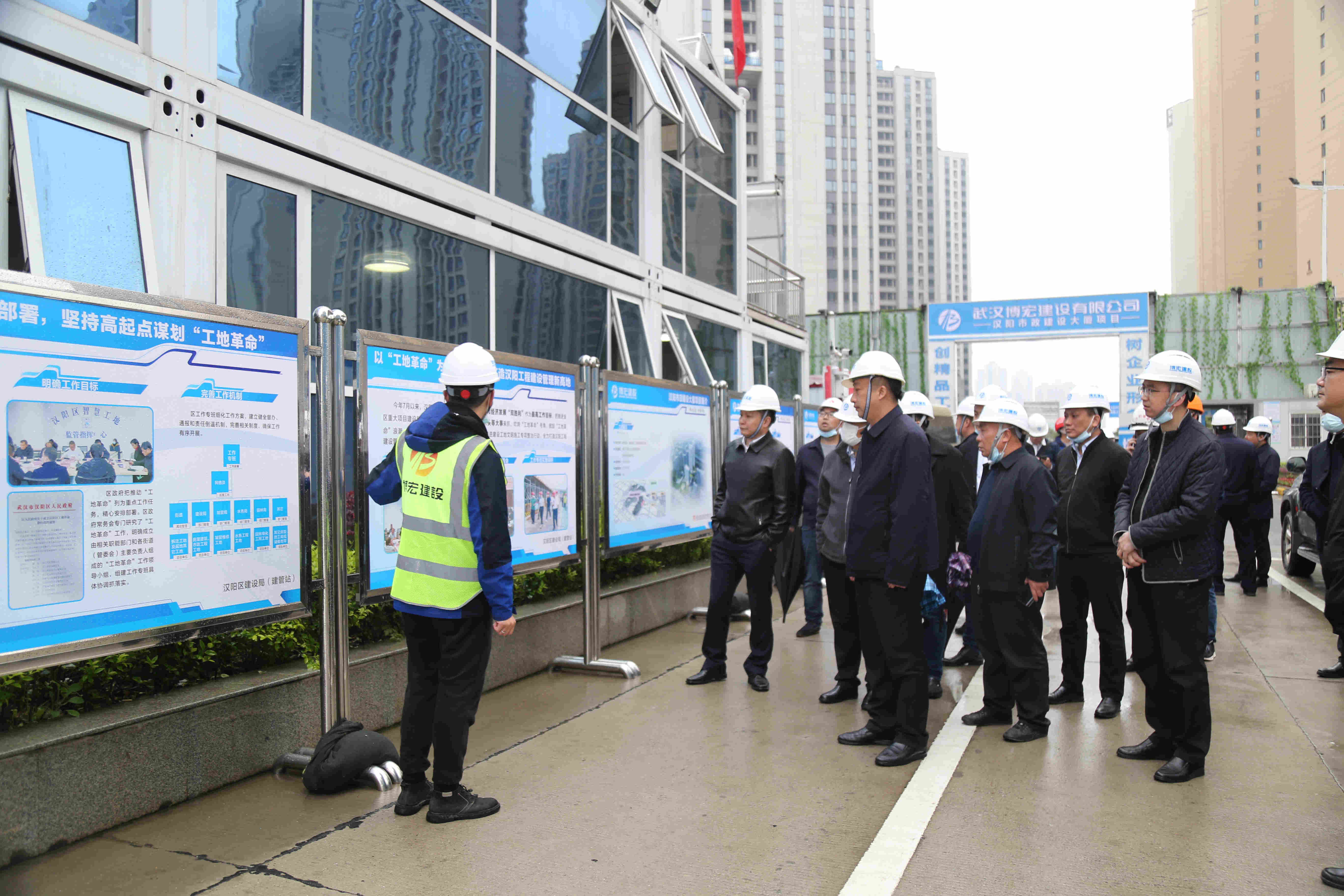 在漢陽市政建設大廈項目現場,仙桃市人民政府副市長徐國亮對現場安全文明施工管理情況進行觀摩,就項目綠色建造、疫情防控、工地革命、技術創新等各項工作進行了解。