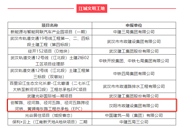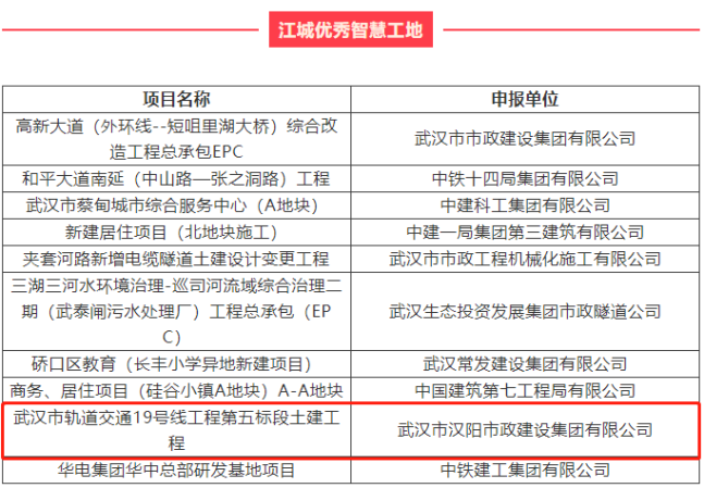 近日,由楚天都市報、武漢建筑業協會、武漢市建筑行業工會聯合會聯合主辦的2021年“創領智控杯”江城“雙十大”選樹結果揭曉,漢陽市政高新三路(三環線-外環線)改造提升工程總承包(EPC)獲評“江城十大智慧工地”,創智路、徑河路、徑河五路、徑河五路跨徑河橋、黃獅海東路工程總承包(EPC)獲評“江城文明工地”,武漢市軌道交通19號線工程第五標段土建工程獲評“江城優秀智慧工地”。