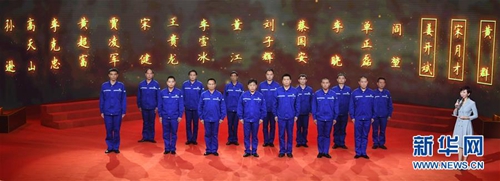 中船重工第七六〇研究所抗災搶險英雄群體中的14位同志(另外3位同志犧牲)參加發布儀式(9月11日攝)。新華社記者 李賀攝