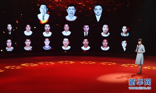在主持人(右一)的引導下,中船重工第七六〇研究所抗災搶險英雄群體中的14位同志(另外3位同志犧牲)參加發布儀式(9月11日攝)。新華社記者 李賀攝