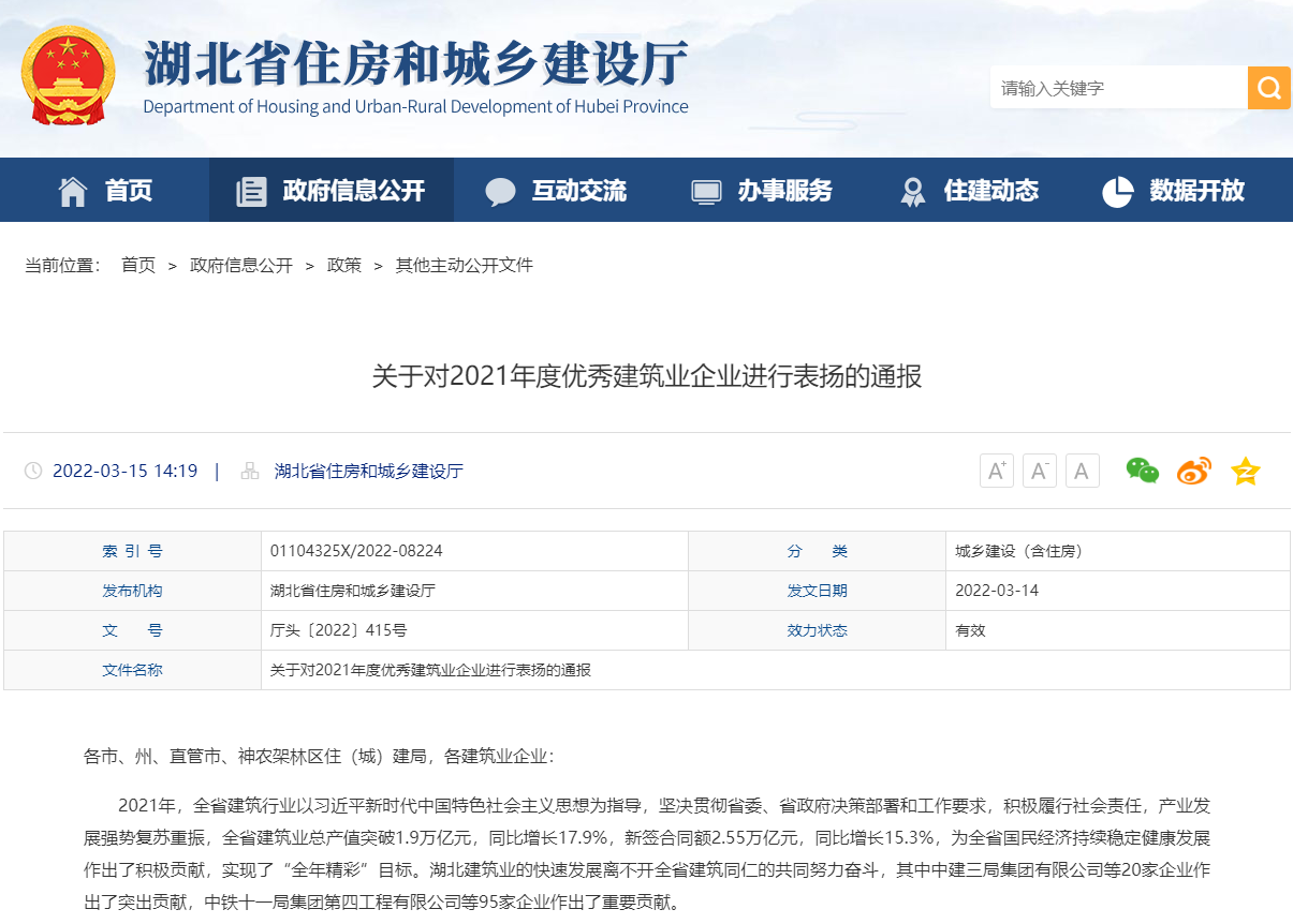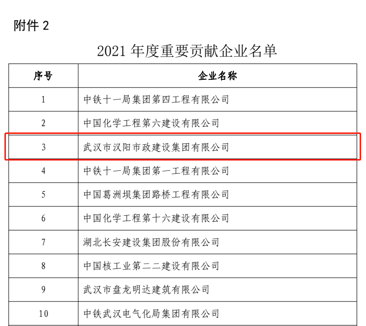 ? ? 3月15日,湖北省住建廳公布115家優(yōu)秀建筑業(yè)企業(yè)名單,揭曉2021年度突出貢獻企業(yè)和重要企業(yè)評選結果,漢陽市政獲評“2021年度重要貢獻企業(yè)”,獲通報表揚。