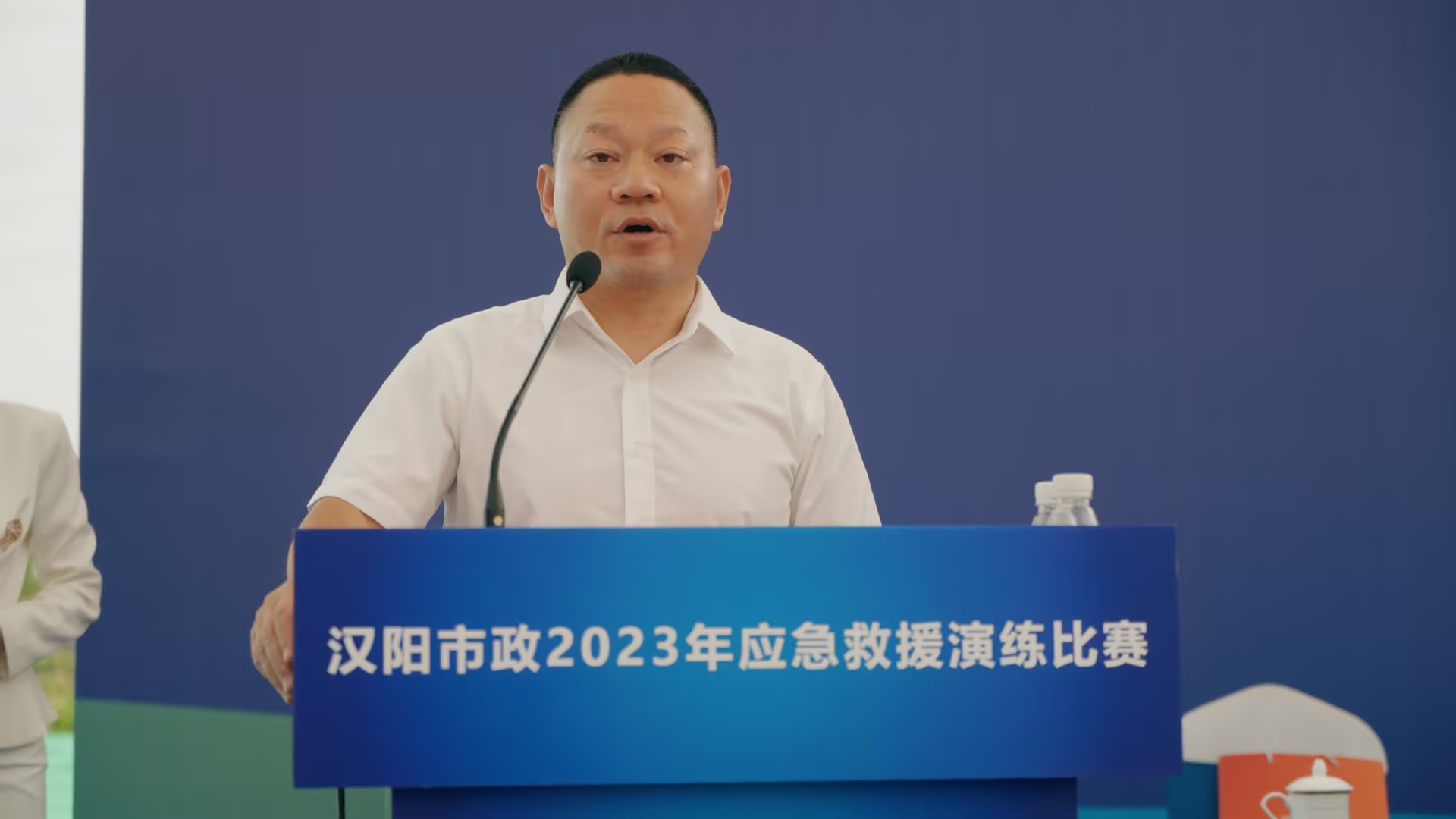 漢陽市政總工程師、演練活動(dòng)總指揮荊武致辭。他提到,漢陽市政始終堅(jiān)持“居安思危,穩(wěn)健拓新”的發(fā)展理念,堅(jiān)持“安全生產(chǎn),自覺規(guī)范”的安全理念,強(qiáng)化安全生產(chǎn)管理,切實(shí)維護(hù)人民群眾生命財(cái)產(chǎn)安全。希望各參賽隊(duì)伍規(guī)范落實(shí)救援動(dòng)作,加強(qiáng)協(xié)作,凸顯漢陽市政優(yōu)秀的安全管理和應(yīng)急救援水平。
