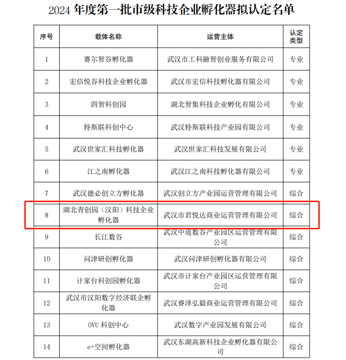 近日,武漢市科技創(chuàng)新局公示了《2024年度第一批市級科技企業(yè)孵化器認(rèn)定和眾創(chuàng)空間備案名單》,武漢市君悅達(dá)商業(yè)運(yùn)營有限公司運(yùn)營的湖北青創(chuàng)園(漢陽)科技企業(yè)孵化器榜上有名,這不僅是園區(qū)發(fā)展歷程中的重要里程碑,更是對武漢市君悅達(dá)商業(yè)運(yùn)營有限公司專業(yè)運(yùn)營實(shí)力的最佳注解。
